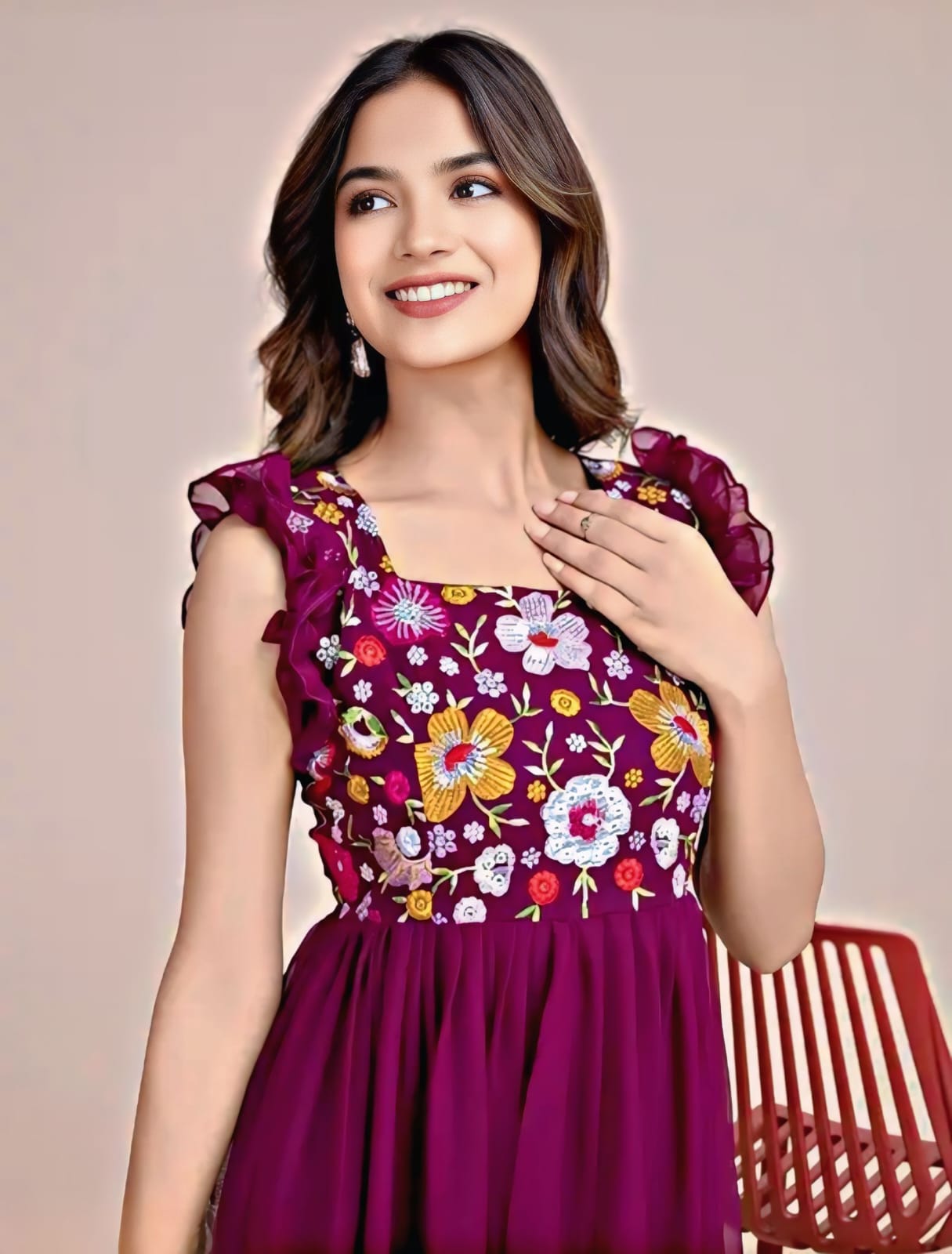 The SINCERO Floral Embroidered Sequin Georgette Gown is a stunning blend of elegance and glamour. Made from flowing georgette fabric, it features intricate floral embroidery adorned with sparkling sequins that shimmer beautifully. With a flattering silhouette, graceful hemline, and exquisite detailing, this gown is perfect for weddings, parties, or any special occasion where you want to make a lasting impression.Hey,