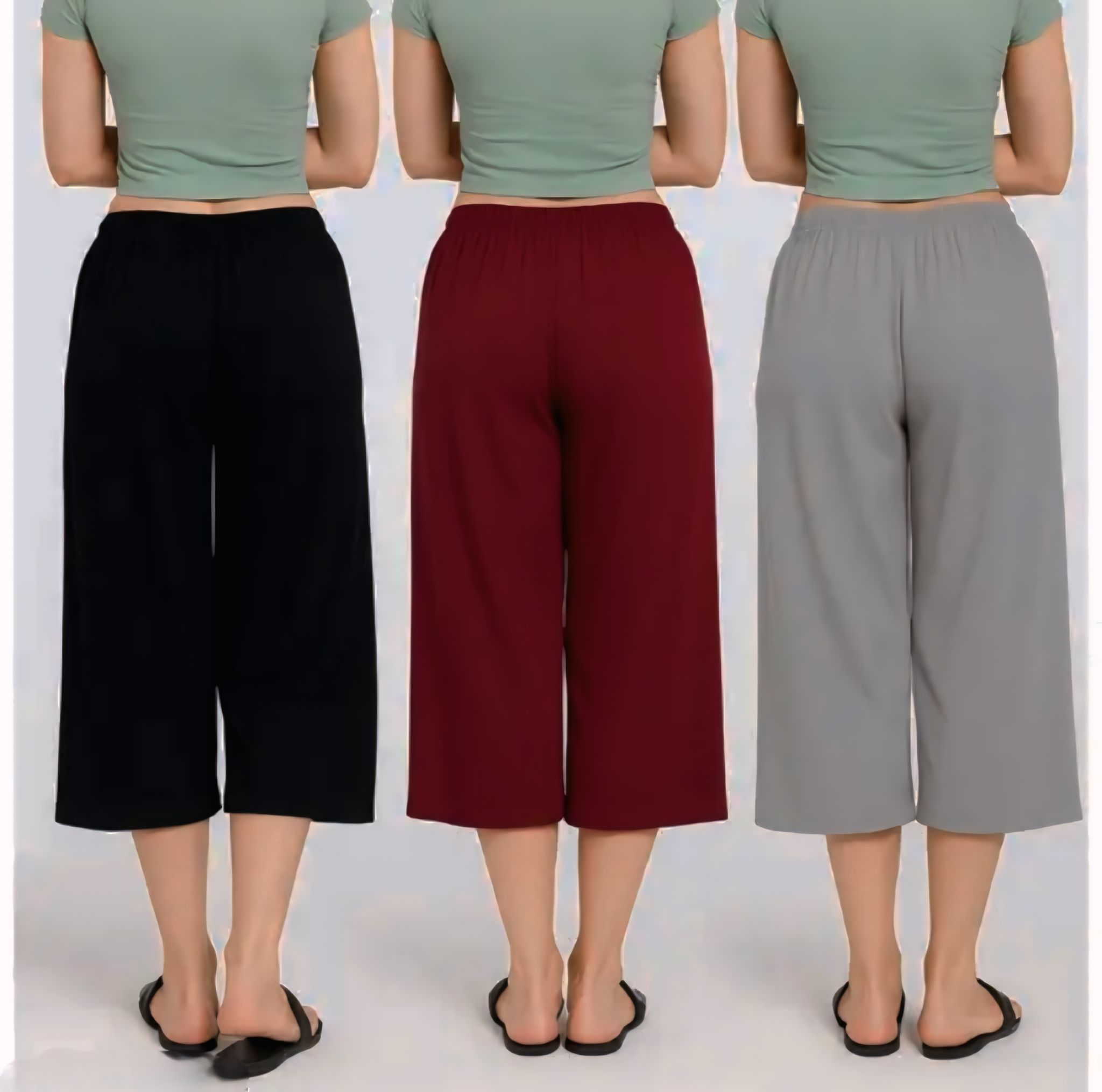 The Women’s Loose Fit 3/4 Capri Trousers Combo Pack is the ultimate blend of comfort, style, and versatility, perfect for modern women who value both fashion and ease. This combo pack includes three essential colors—Black, Grey, and Marrone—allowing effortless mix-and-match options with a variety of tops, tunics, or tees. Crafted from high-quality, breathable fabric, these 3/4 capri trousers offer a loose fit that ensures freedom of movement, making them ideal for daily wear, casual outings, indoor lounging, or light workouts. The relaxed design provides a flattering silhouette while keeping you comfortable throughout the day, and the durable fabric ensures long-lasting wear even with frequent use. Easy to style, maintain, and wear, these capri trousers are perfect for women who want a combination of comfort, practicality, and modern style in their everyday wardrobe. Whether paired with sneakers for a casual look or sandals for a relaxed outing, the Loose Fit 3/4 Capri Trousers Combo Pack is a must-have for versatile, effortless fashion.